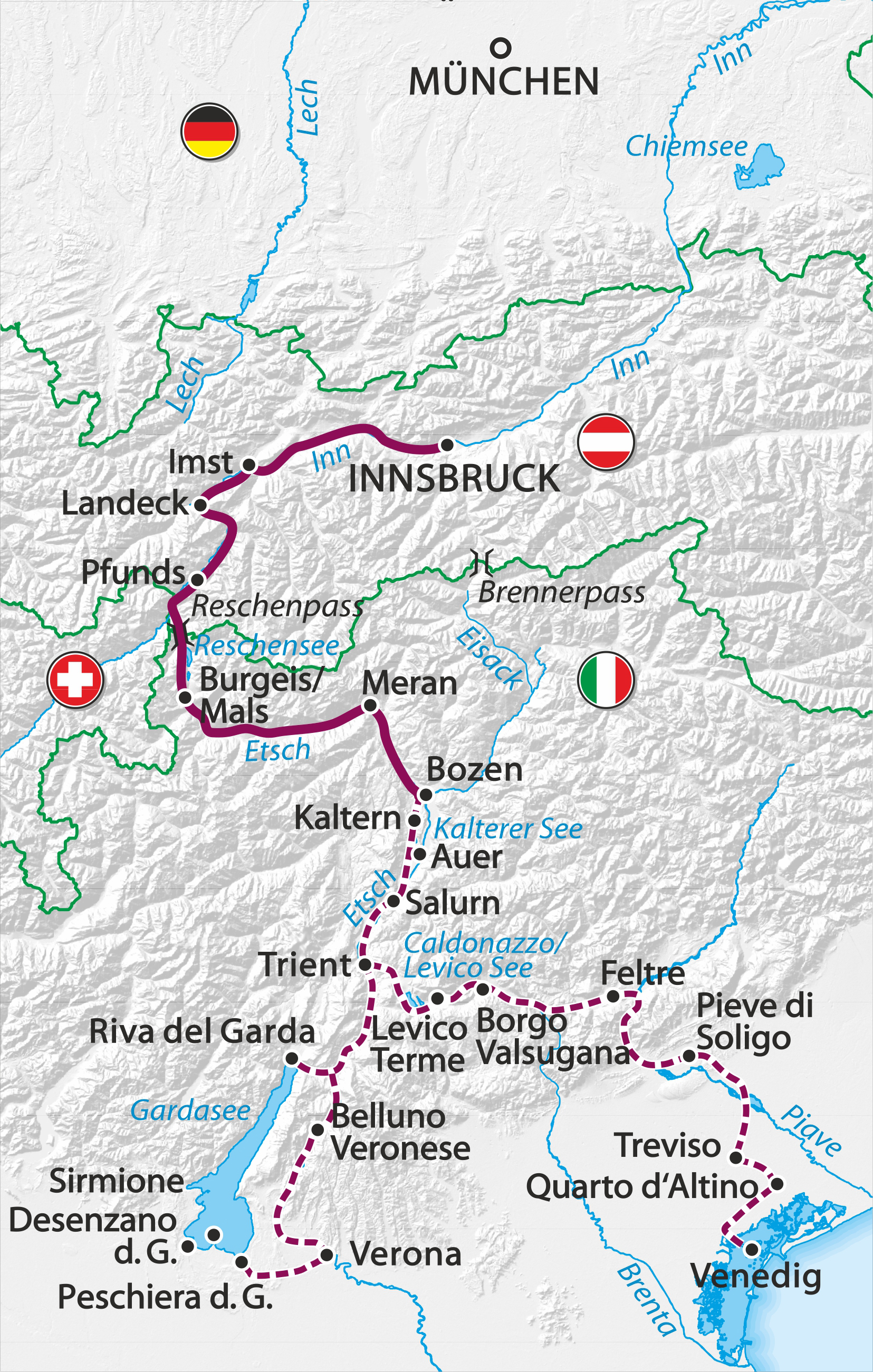 Per Transfer überwinden Sie die Steigung bis Nauders am Reschenpass. Ab dem Reschensee in Südtirol führt Sie der Etschradweg entlang des verspielten Flusses durch die üppigen Obst-Kulturlandschaften des sonnenverwöhnten Vinschgaus bis in die Kurstadt Meran. In ihrem mediterranen Flair flanieren Sie an der Passer Promenade oder tauchen ein in die farbenfrohe Pflanzenwelt der Gärten von Schloss Trauttmansdorff.