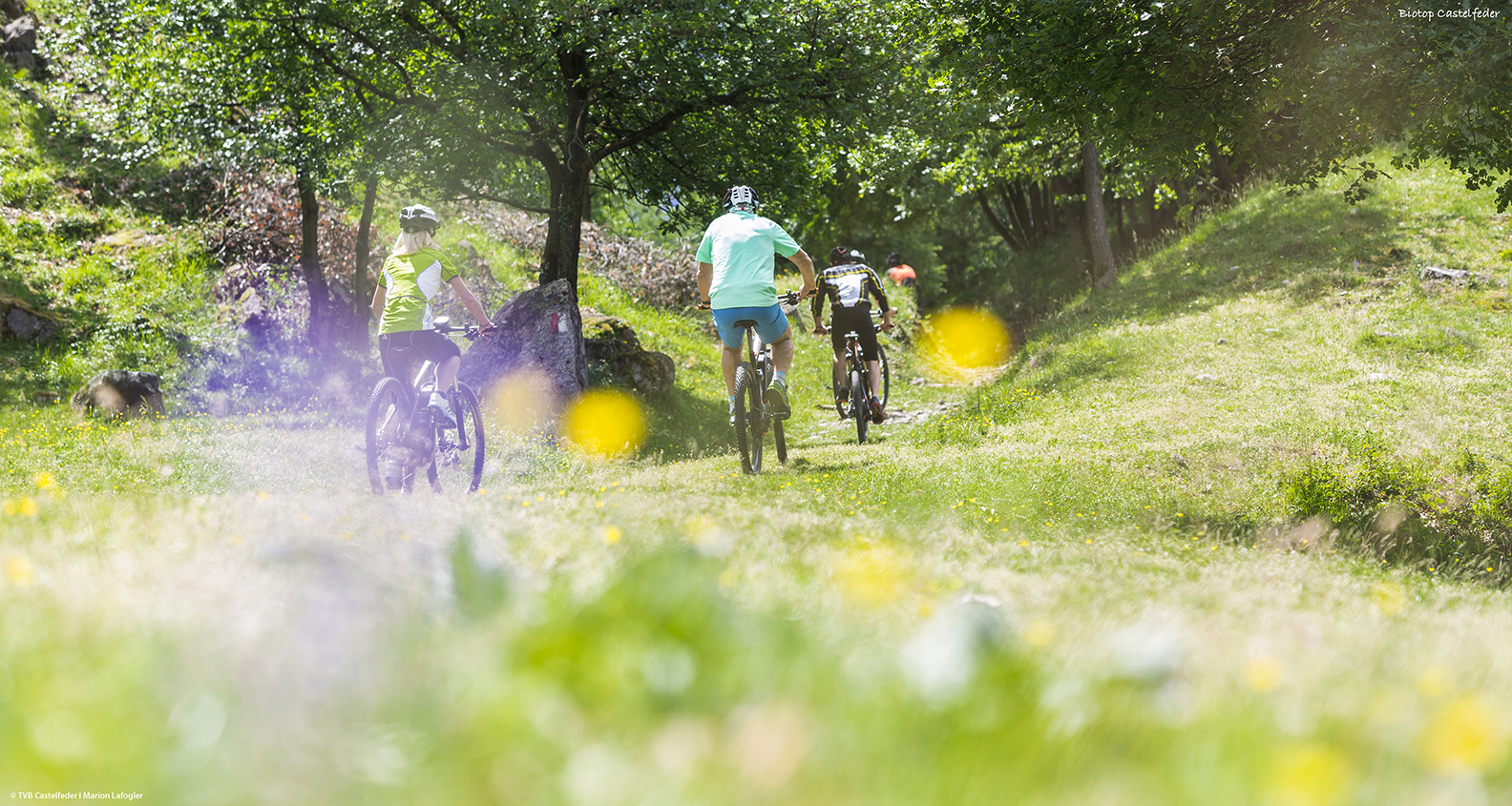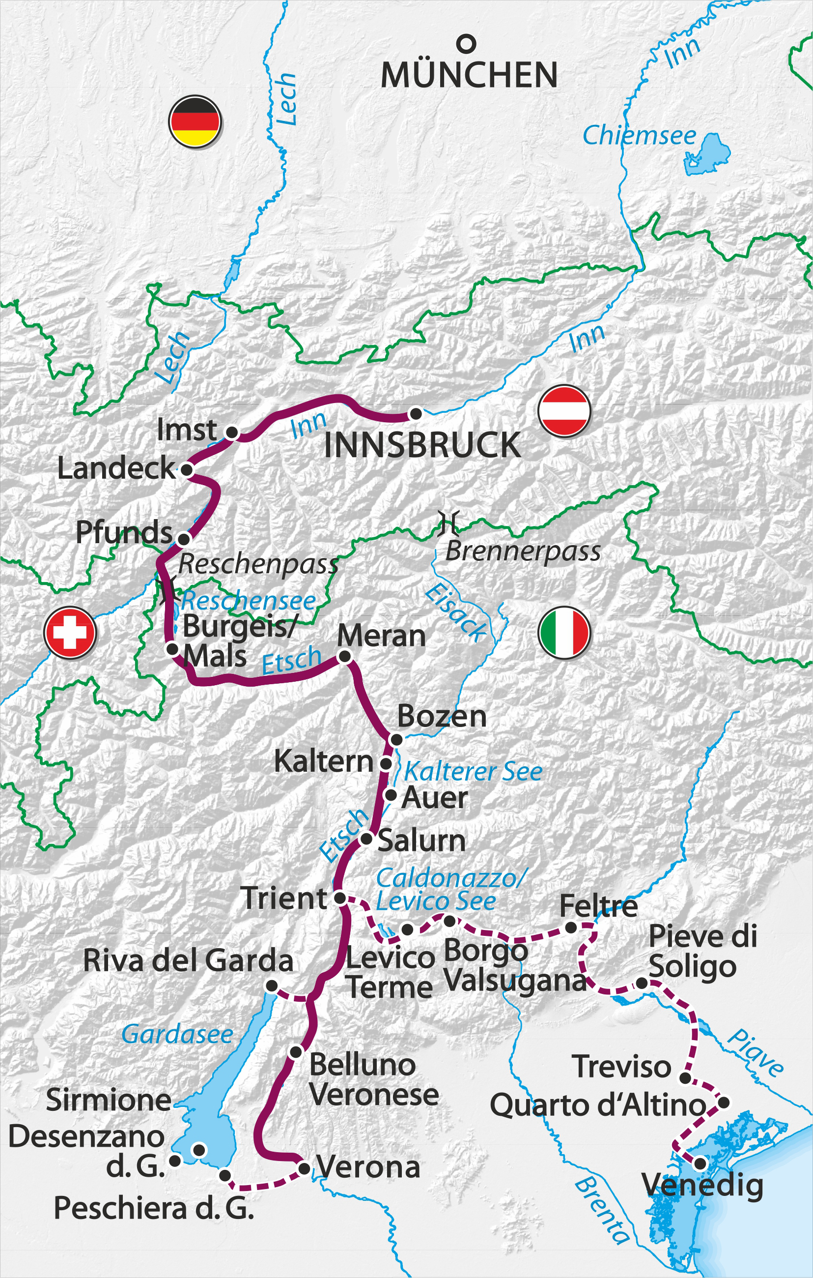 Per Transfer überwinden Sie die Steigung bis Nauders am Reschenpass. Ab dem Reschensee in Südtirol führt Sie der Etschradweg entlang des verspielten Flusses durch die üppigen Obst-Kulturlandschaften des sonnenverwöhnten Vinschgaus über die Kurstadt Meran bis in die Ferienregion Castelfeder.