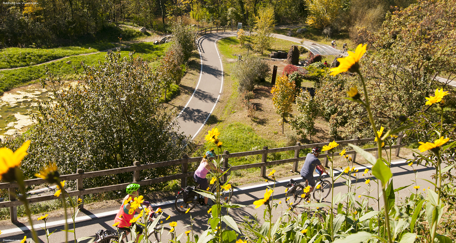 Südliches Flair versprühen bereits die Weingärten, die sich in schwungvollen Linien der Landschaft anpassen und das Südtiroler Unterland nahtlos ins Trentino übergehen lassen. Flankiert von schroffen Porphyrwänden zur linken und sanften Olivenhainen zur rechten Seite, bahnt sicher der Etschradweg zielstrebig seinen Weg bis Verona, der Stadt die einem kulturellem Bilderbuch gleicht und schon als zauberhafte Bühne für Shakespeares Mythos von Romeo und Julia diente.